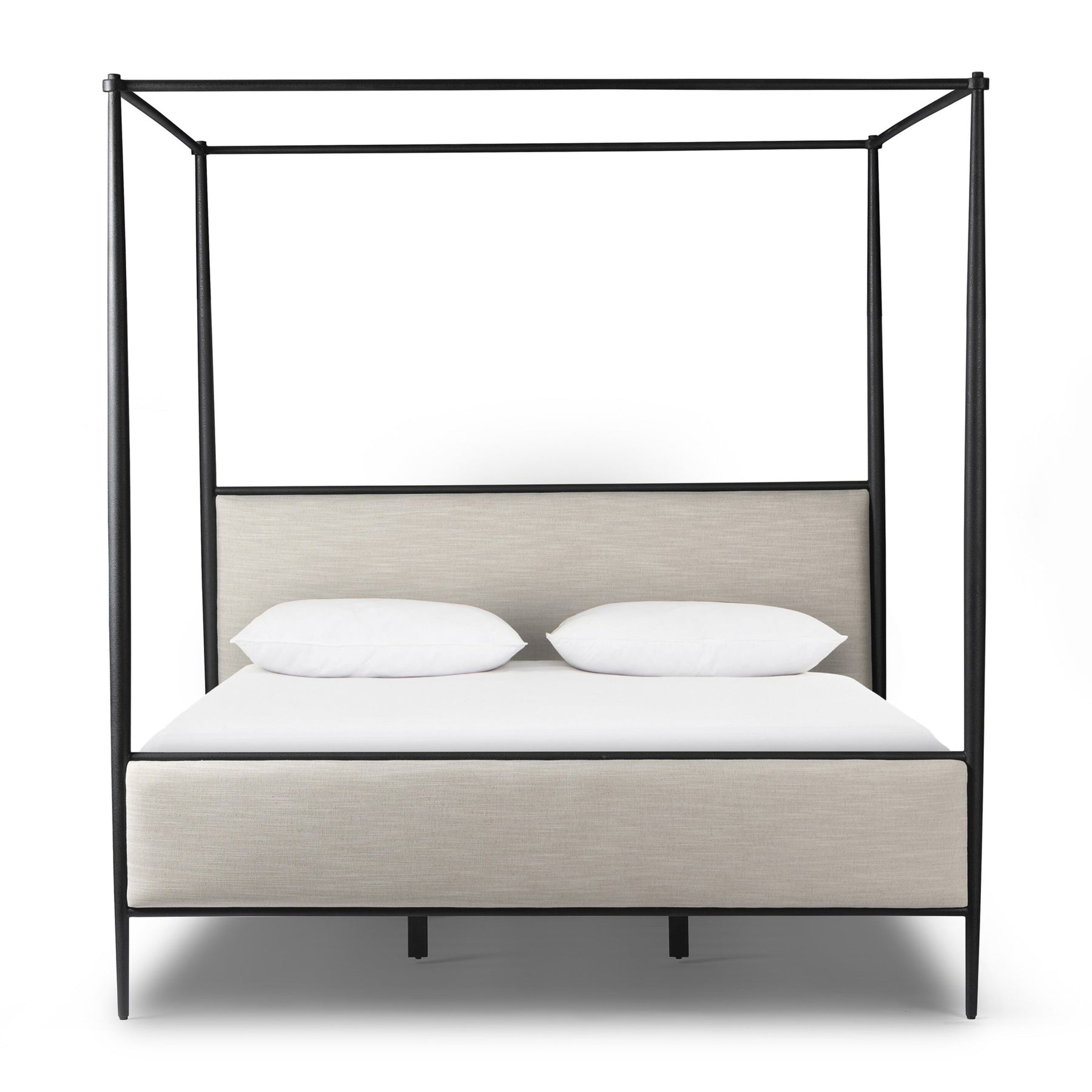 The Xander Canopy King Bed from Four Hands offers a modern, streamlined take on a classic silhouette. Featuring a textured black iron frame with elegant tapering at both the top and bottom, this bed creates a striking sense of verticality without weighing down the room. A softly padded headboard upholstered in a cream-toned linen blend provides a refined contrast to the dark metal, ensuring a comfortable and sophisticated sanctuary for rest.