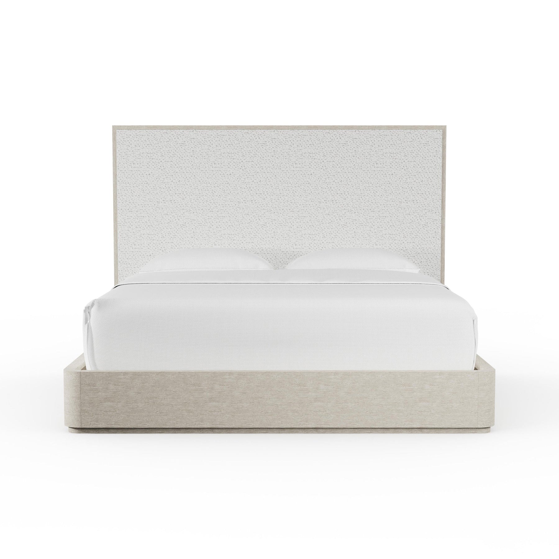 The Loggia Shelter Bed from Bernhardt redefines modern sanctuary with its sweeping, upholstered curves. The headboard's distinctive winged profile arcs gracefully toward the floor, embracing the side panels to create a cozy, enveloping retreat. Fully upholstered in a neutral B163 performance fabric, the soft, tailored form is grounded by exposed wire-brushed oak feet in a translucent Aria finish, blending plush comfort with organic, structural details.
