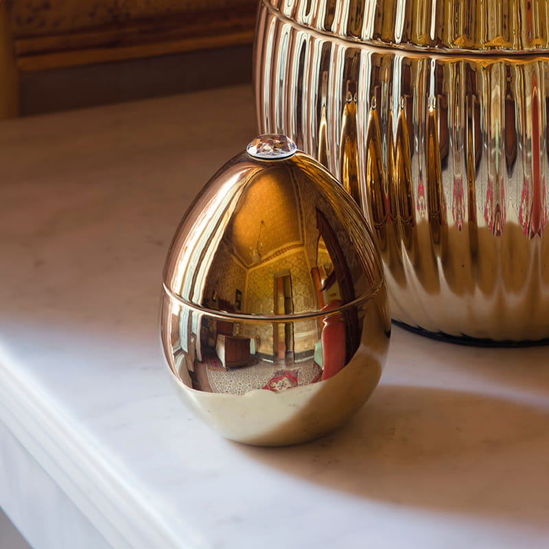 The Bois de Roussie 18k Golden Egg Candle from Ladenac is a 3-kilogram masterpiece, inspired by the legendary Third Imperial Egg. This giant ceramic vessel features an intricate grooved texture finished in brilliant yellow gold and is topped with a decorative crown ornament. Designed as a dramatic focal point for large areas, it has five wicks for an even burn. It releases a sophisticated "Bois de Russie" aroma with notes of elegant smoke and aged woods.